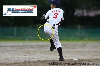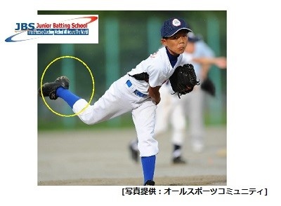 跨步出去時,自由腳的膝蓋跟腰部向外開掉的話,重心就會向側邊移動,如此就無法將力量傳達到目標(投球方向)。。